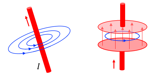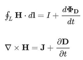 麦克斯韦-安培定律描述电场和磁场与电流之间的关系。此定律表明磁场的生成方法包括传导电流(安培定律)和时变电场(位移电流)两种形式,如下示意图所示。由于增加位移电流这一项,麦克斯韦才得以准确地预测光本身也是一种电磁波。