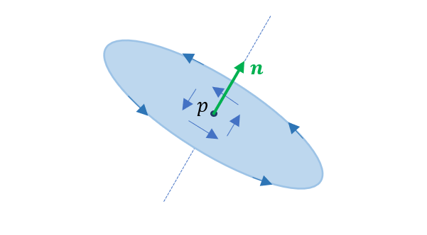 为旋度算符,其运算公式如下所示。其中 i、j、k 为分别对应x、y和z轴的单位矢量。旋度表示向量场对某一点附近的微元造成的旋转程度。旋度本身为矢量,空间中某点p的旋度矢量 n 如下图所示,方向满足右手定则。