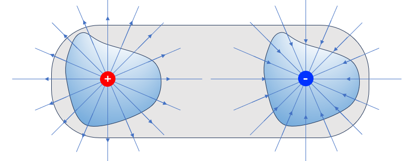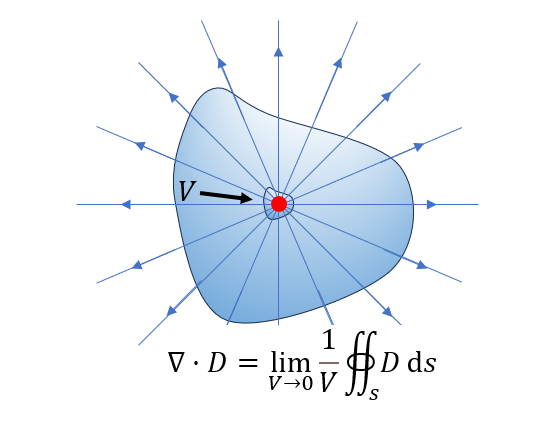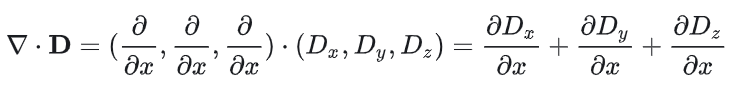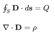 高斯定律描述电荷分布与随之产生的电场之间的关系。电场线从正电荷开始,到负电荷终止(或延伸至无穷远)。此定律表明穿过某一闭合曲面的电通量,可以理解为电场线数量,等于闭曲面内的总电荷 q。如下为高斯定律公式的积分形式和微分形式,其中电位移矢量