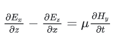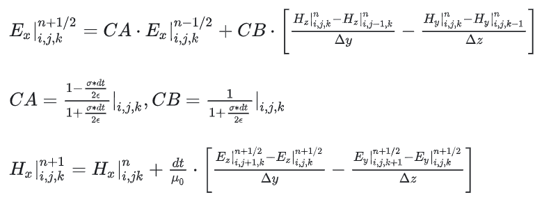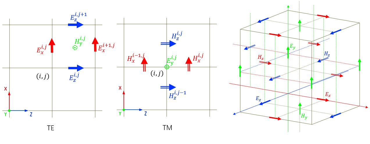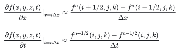根据上述方程, 在yee cell网格上进行差分离散,使用中心差分近似麦克斯韦微分方程: