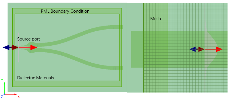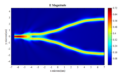 y分束器是集成光子器件中一种非常重要的单元器件,它有非常广泛的应用,如波导干涉仪、调制器、光开光、光分束器等。我们可以在仿真软件中进行建模仿真, 如下图所示。根据麦克斯韦方程组及fdtd求解算法,仿真空间具有边界条件,介质分布将在网格中呈现,添加的光源可以位于空间内的任意位置。