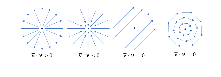 如下为空间中矢量场求解散度后的结果示例,可以帮助理解散度的运算。