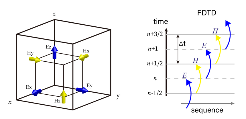 fdtd中的电磁场基于yee cell网格在空间中交错分布 (下图左)。电场分布在网格棱线中心,磁场分布在网格面中心。每一个电场分量和与它相邻的并且垂直于该电场分量的4个磁场分量,满足麦克斯韦旋度方程(磁场同理)。fdtd中离散化的电磁场在时间上是交错迭代,采用蛙跳法逐步递推求解(下图右)。