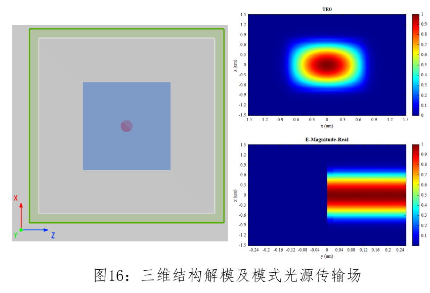 模式光源一般使用在光波导当中。在添加模式光源时,我们需要先在光波导结构横截面上进行本征模式求解(fde解模),以获得所需模式光源的频率、空间分布等信息。然后从解出的te或tm模式中选择一种,并将其引入到fdtd迭代中。关于fde解模的详细内容,您可以参考fde解模。 一旦确定所选模式光源的场分布,我们可以按照与高斯光源相同的方式将能量分配到fdtd网格中,从而得到对应的模式光源。下图展示了3d结构的fde解模结果以及引入模式源后的传输场。