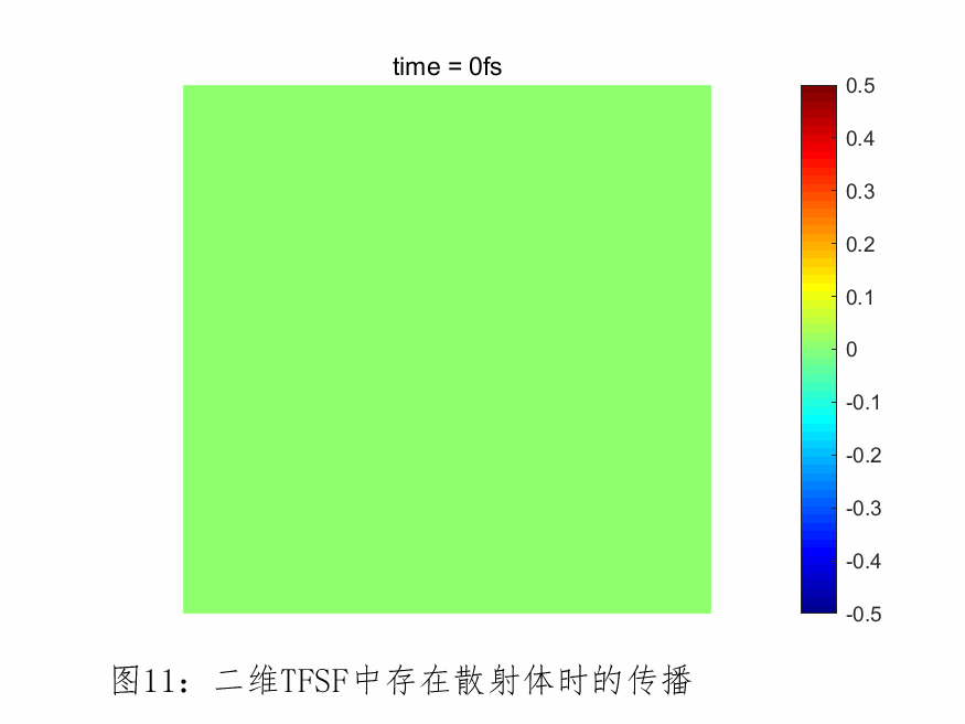 下图为tfsf光源正入射一个散射体小球,场在fdtd空间的传播情况。