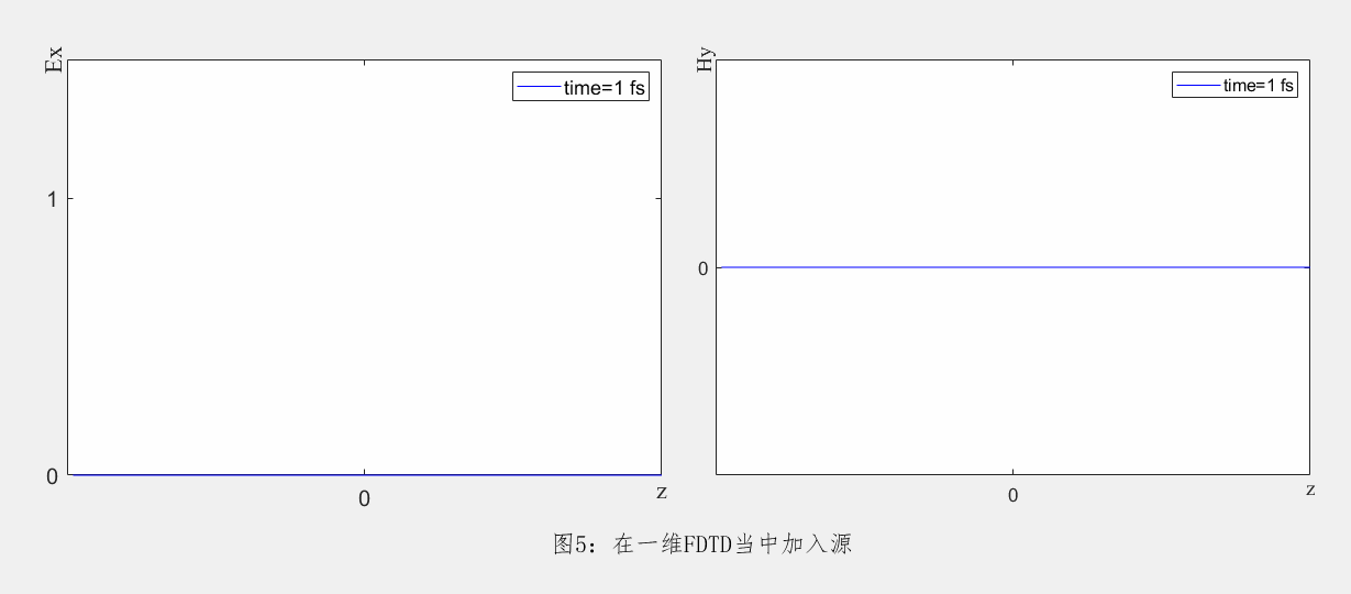 在fdtd数值计算当中,激励源的加入方式大致有以下两种。一种是指在仿真空间中的一个点或面上设置固定的辐射强度,其辐射特性不随空间位置变化而改变。以一维fdtd为例,在原点处将ex分量赋值为高斯脉冲,其在fdtd的传播情况如下。