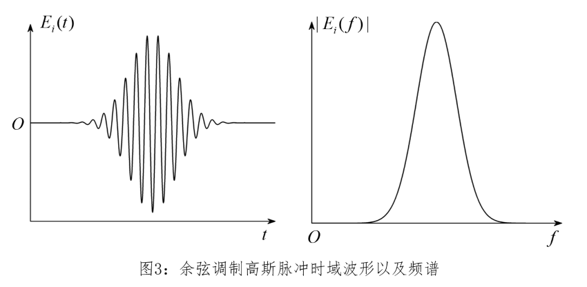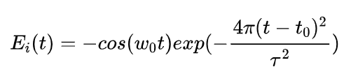 而脉冲波源的频谱具有一定的带宽,由于实际光源大部分都为宽频带,因此在fdtd数值计算当中大多采用脉冲波源。 常见的脉冲信号有高斯脉冲,矩形脉冲(方波),单周期正弦脉冲等。以下简单介绍调制高斯脉冲的时域频域特征。 余弦调制高斯脉冲,即高斯脉冲信号乘以一个余弦调制函数,来控制脉冲的起始时间和幅度等特性,用以满足不同领域对脉冲信号的需求。此时其时域形式为: