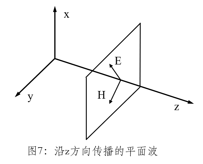 而平面波解作为波动方程一种最基本的特解,于是我们可以求解出沿z方向上传播的平面波,其复数形式的解如下
