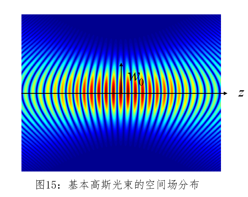 根据上述可以得到在均匀介质传播的基本高斯光束的空间场分布。如下图所示结果