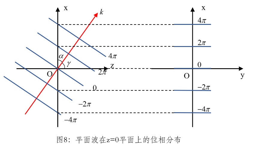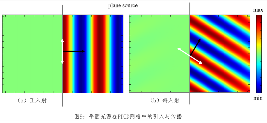 如图8中右图所示,可以看到等相线是平面波的等相面与 z=0 平面的交线。故我们可以知道,当平面波垂直入射时,在yee-cell网格当中光源所在位置的直线上设置完全相同,而倾斜入射时也仅需进行插值即可。