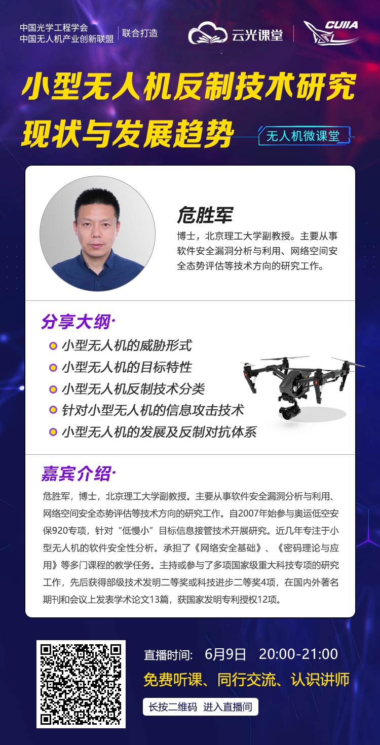 6月9日(周二)20:00,中国光学工程学会特邀北京理工大学危胜军副教授做客云光课堂,在线直播——《小型无人机反制技术研究现状与发展趋势》主要介绍小型无人机的分类及技术特性及其反制技术的发展方向,重点讨论针对小型无人机的信息攻击技术。