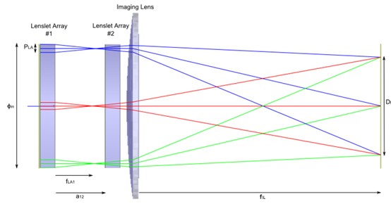 小透镜阵列可应用在很多方面,其中包含光束均匀化。本文演示了一个用于在探测器上创建均匀的非相干照度的成像微透镜阵列的设计。输入光束具有高斯轮廓,半宽度等于微透镜阵列大小,并且显示了其功率轮廓被微透镜阵列消除掉。