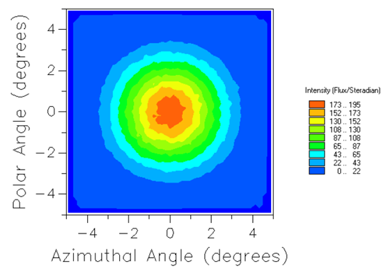 简单示例系统由单色光源组成,空间高斯切趾功率(1/e2=5mm)和0.6度半发散角,两个相同的33*33透镜阵列(10mm孔径),微透镜焦距4.80mm和单个微结构0.3mm,成像透镜焦距100mm及位于成像透镜的后焦平面位置的一个探测器平面。