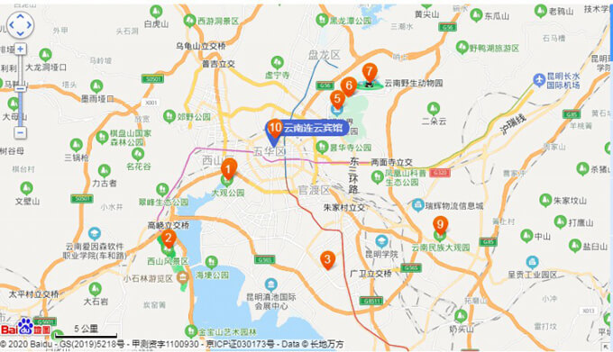 火车站:距昆明火车站8公里,乘出租车15分钟到达酒店