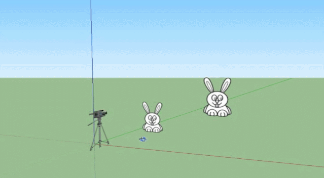 本文对推动这一切发展的底层核心技术,即散斑结构光三维传感技术,进行了浅析。首先,以人类和动物用双眼感知三维世界为例,引出三维测量的基本原理——双目立体视觉。实际上,单个人眼和普通的相机无法判断看到的尺寸究竟是由于距离不同导致还是物体本身大小导致。例如下图里的例子中,两只摆放远近不同的且尺寸不一样大小的“兔子”竟然可以通过不同的观察视角变的一样大!