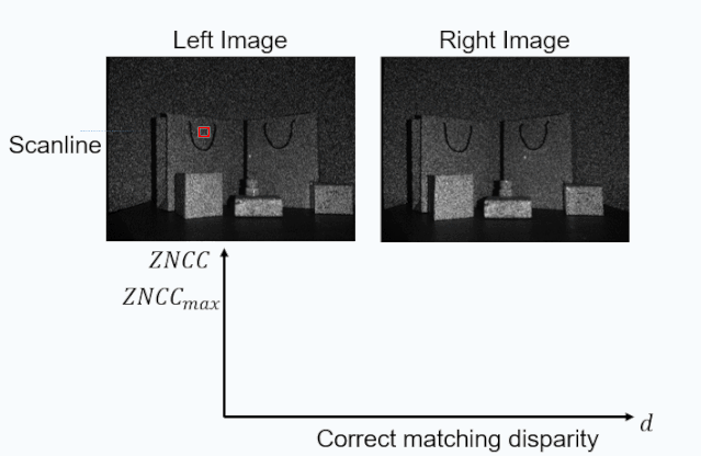 那么如何通过散斑获取匹配点呢?我们可以直接对两张散斑图像进行逐像素点的滑动窗口匹配来获得它们之间的一一对应关系。如下图所示,对于左图中的一个像素点(左图中红色方框中心),在右图中从左到右用一个同尺寸局部窗口内的像素和它计算相似程度,相似度的度量有很多种方法,常用的相关函数有零均值归一化互相关函数(zncc)、零均值归一化差平方和函数(znssd)等。除了匹配代价函数的选取,本文还介绍了典型的成本聚合策略,局部匹配,子全局匹配和全局匹配算法。此外还对三维重建过程中潜在的一些问题进行了分析和讨论,例如:如何获取亚像素匹配精度、如何选取算法匹配窗口大小等。
