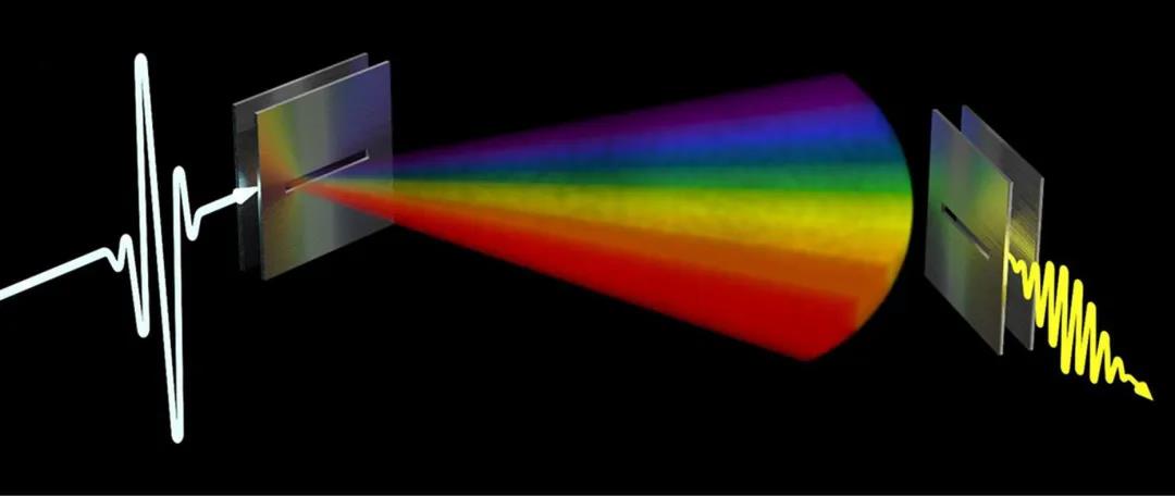 研究人员设计了如图1所示的实验装置,其中发射器和移动接收器都配备有漏波波导。漏波波导由两块间距为1.04 mm的铝板构成(对应te1模式截止频率~144 ghz),其中一块铝板上有开口,允许太赫兹波从开口处向外辐射。发射器使用宽带脉冲光源激发波导的te1模式,宽带太赫兹波通过漏波波导以“太赫兹彩虹”的形式在一定频率范围内填充空间。不同传播方向上的太赫兹波频率满足如下条件: