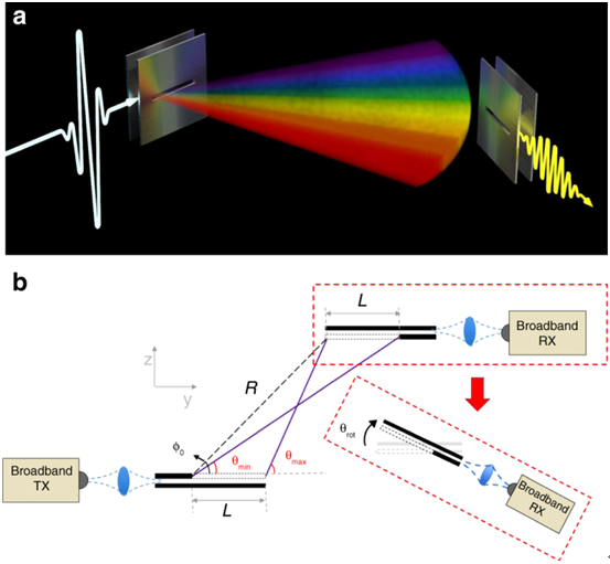 图1 a.漏波波导被宽带输入信号激发后发出的“太赫兹彩虹”。同时采用漏波波导的接收器捕获此宽带信号的一部分。b.实验示意图:阐明了接收器波导平行于发射器波导以及出现一定角度旋转的情况。接收器所接收频谱的范围不仅可以用于确定接收器所处的角度方位信息,而且可以用于确定接收器相对于发射器的旋转角度。(tx:发射器;rx:接收器)