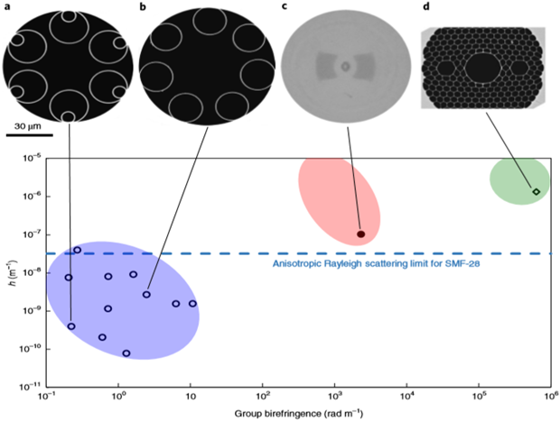 图1 (a)和(b)为反谐振空芯光纤和(c)保偏光纤(d)空芯光子带隙光纤在1550nm处的偏振耦合强度对比。