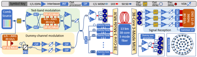 来自日本国家信息和通信技术研究所的georg rademacher等人利用38芯3模光纤,结合了空分复用技术(sdm)和波分复用技术(wdm),在c l波段实现了24.5gbaud的64-qam和256-qam的传输,聚合数据速率达到了10.66pb/s。单个空间信道速率达到了93.5tb/s,距离现有单模光纤传输纪录不到10%。相关研究成果以题目“10.66 peta-bit/s transmission over a 38-core-three-mode fiber”于2020年3月发表在美国光纤通信会议(optical fiber communication 2020)上,被评为所在专题的top-scored。