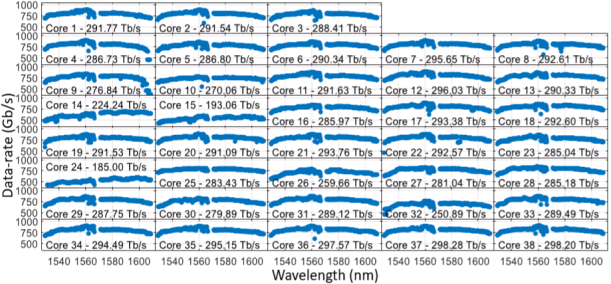 对38个纤芯的368个波长信道进行编码后,32个纤芯速率在279tb/s到298tb/之间,其余最低的速率也达到了185tb/s。