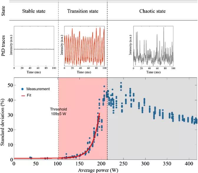 图1 随着平均功率的提升激光光束稳定性的演化。图中给出了光电探测器测量轨迹的标准差的变化趋势(下图),激光系统的三种运行状态(稳定-过渡-混沌)对应的光电探测器轨迹(上图)。