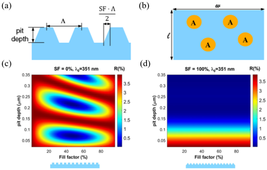 根据bruggeman’s联合公式,研究人员设计了用于多层平面的熔融石英材料结构(见图1(a)和(b)),通过填充因子近似表示该层的有效折射率。填充因子指数将随基质和空隙体积的混合比而变化,变化率取决于特性高度。基于该纳米几何结构的传输矩阵计算结果如图1(c)和1(d)所示。通过控制纳米结构特征高度和侧壁倾斜度,可以设计具有指定特征波段的抗反射结构。
