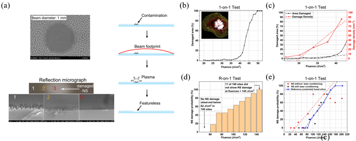 图2 样品激光损失实验结果:(a)纳米结构表面损伤形貌sem表征;(3b)和(c)351nm激光损伤试验结果;(d)和(e)1053nm激光损伤试验结果。