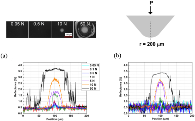 图3 纳米结构静态鲁棒性实验结果:使用半径为200μm的标准尖端加载(a)351nm结构和(b)1053nm结构,负载范围为50 mn至50 n。