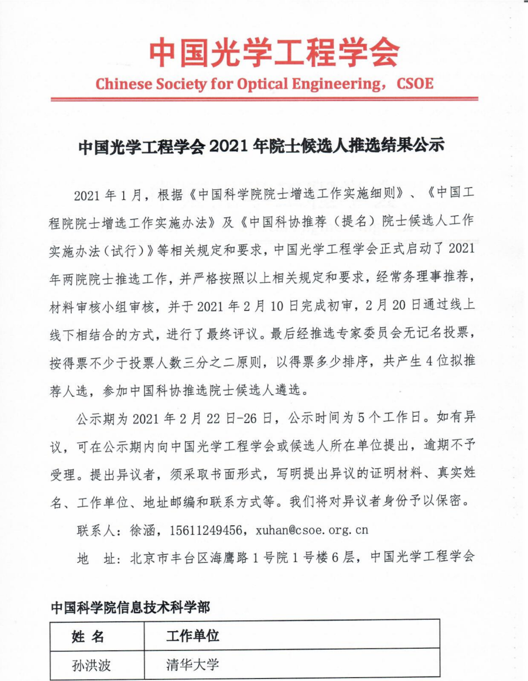 公示期为2021年2月22日-26日,公示时间为5个工作日。如有异议,可在公示期内向中国光学工程学会或候选人所在单位提出,逾期不予受理。提出异议者,须采取书面形式,写明提出异议的证明材料、真实姓名、工作单位、地址邮编和凯发k8官网首页登录的联系方式等。我们将对异议者身份予以保密。