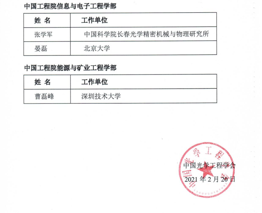 2021年1月,根据《中国科学院院士增选工作实施细则》、《中国工程院院士增选工作实施办法》及《中国科协推荐(提名)院士候选人工作实施办法(试行)》等相关规定和要求,中国光学工程学会正式启动了2021年两院院士推选工作,并严格按照以上相关规定和要求,经常务理事推荐,材料审核小组审核,并于2021年2月10日完成初审,2月20日通过线上线下相结合的方式,进行了最终评议。最后经推选专家委员会无记名投票,按得票不少于投票人数三分之二原则,以得票多少排序,共产生4位拟推荐人选,参加中国科协推选院士候选人遴选。