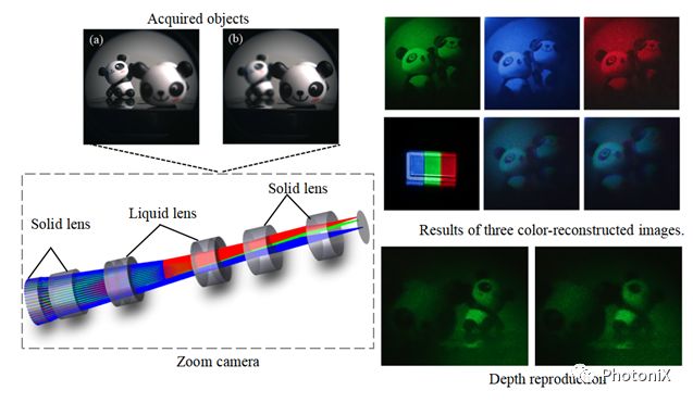 本文介绍了基于电润湿效应控制液体界面的曲率,来自适应调节相机焦距的技术,从而实现真实物体的变焦拍摄。同时本文编码了具有大焦深的数字锥透镜,其光学特性可完美适用于全息投影,特别是多层成像。通过在空间光调制器上加载数字锥透镜的相位,重建的图像可以实现大深度的投影。所提出的系统可实现真实物体的全息变焦拍摄和彩色再现。
