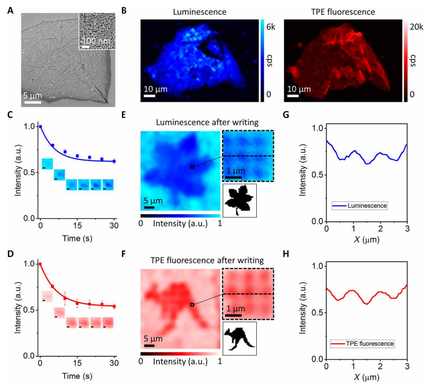 图2中,(a)基于go与ucnps结合的纳米复合材料的扫描电镜(sem)图。插图:纳米复合材料的高分辨率扫描电镜图像。(b)纳米复合材料的双色共焦成像,记录来自ucnps的上转换发射(左)和来自go薄片的tpe荧光(右)。(c和d)reta光学写入过程上转换发射和tpe荧光的时间相关测量。插图:通过上转换发射猝灭和tpe荧光抑制对单个特征进行双通道表征。比例尺,200纳米。(e和f)上转换发射和tpe荧光光栅扫描通过reta光学写入方法所制作的特征图案。(g和h)沿(e)图和(f)图中间虚线的强度分布。