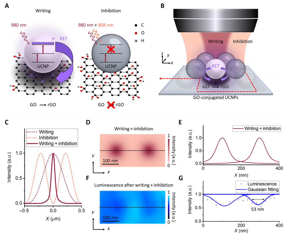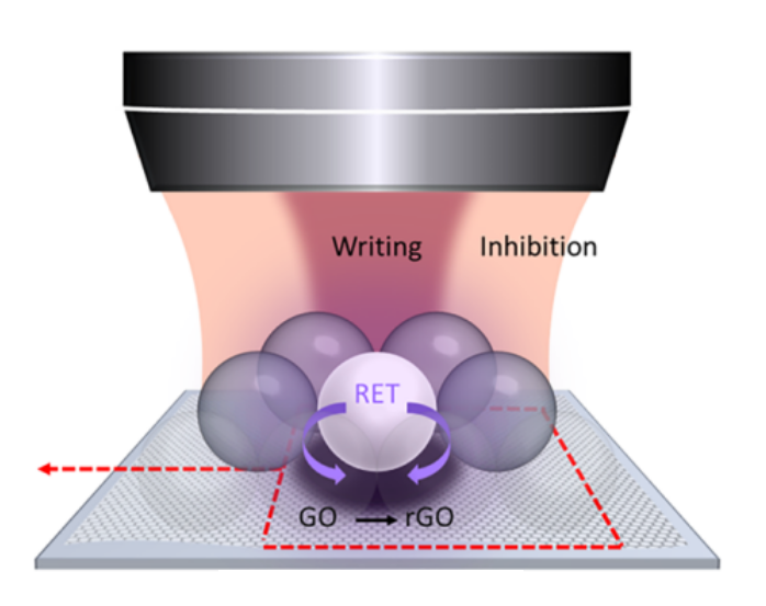 图1 go与ucnp结合的纳米复合材料通过reta实现纳米级光学写入原理。