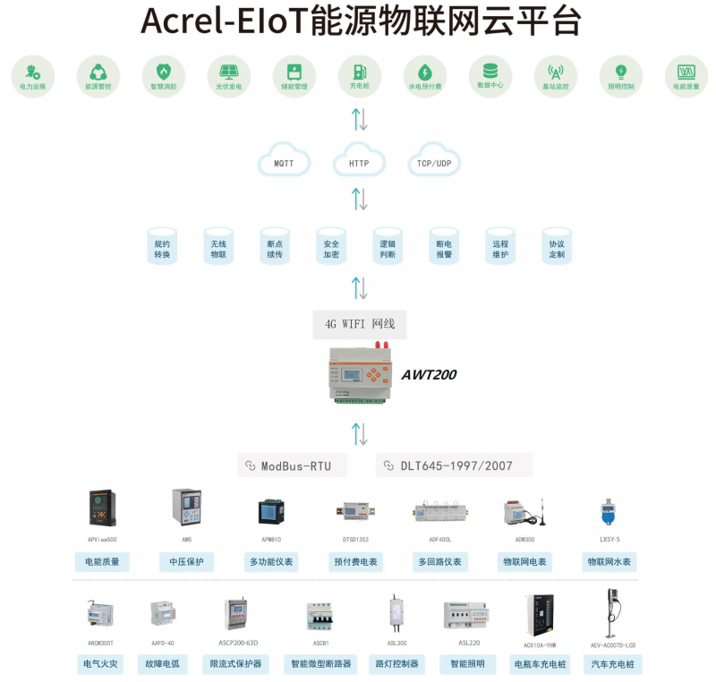 awt200数据通讯网关应用于各种终端设备的数据采集与数据分析。实现设备的监测、控制、计算,为系统与设备之间建立通讯纽带,实现双向的数据通讯。实时监测并及时发现异常数据,同时自身根据用户规则进行逻辑判断,大大的节省了人力和通讯成本。