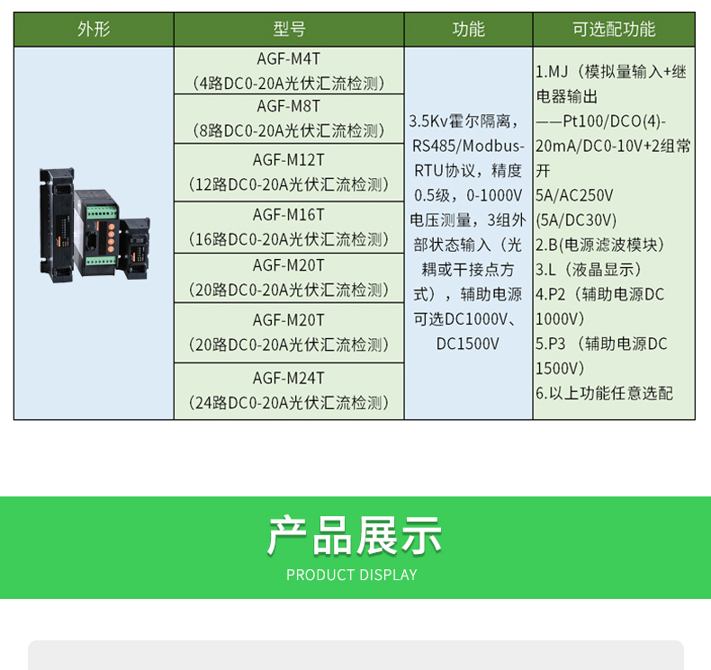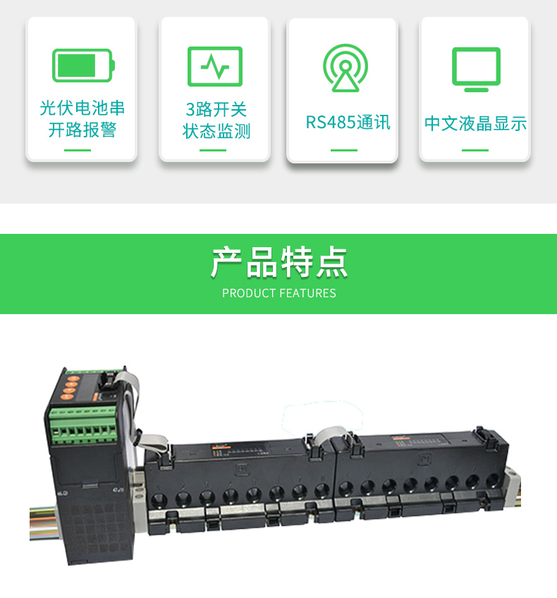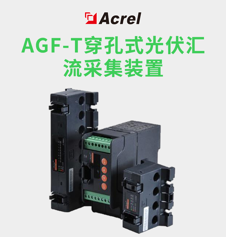 agf-t穿孔式光伏汇流采集装置是专门应用于智能光伏汇流箱,用于监测光电池阵列中电池板运行状态,组串电流测量,汇流箱中防雷器状态采集、直流断路器状态采集、装置带有rs485接口可以把测量和采集到的数据和设备状态上传。