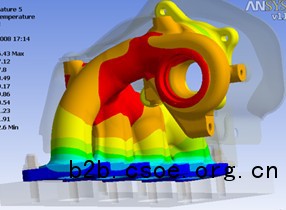 在ansys workbench环境完成的汽车排气歧管分析。ansys fluent求解的共轭传热模型的温度映射到ansys mechanical热-应力求解