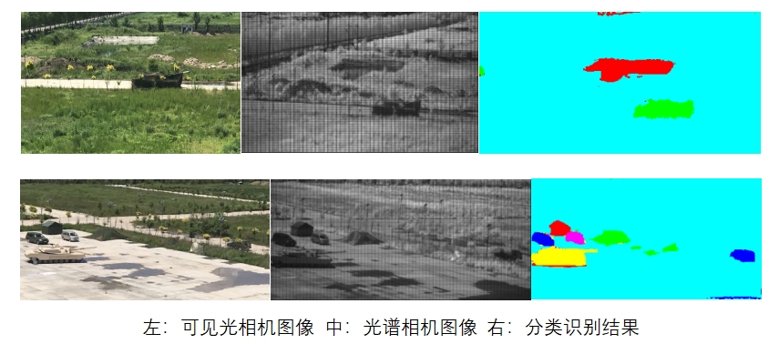 相机进行伪装识别实验,在较远距离观测条件下,人眼难以对伪装网、迷彩车辆等目标进行识别,光谱相机根据不同目标在各谱段的响应不同,能够对视场中的车辆、地形等目标实现识别: