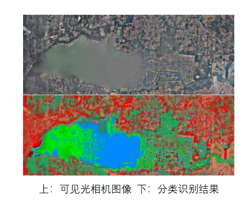 图为使用光谱相机进行环境遥感监实验,能够对蓝藻水华分布实现识别,识别结果图中绿色为蓝藻水华污染严重区域: