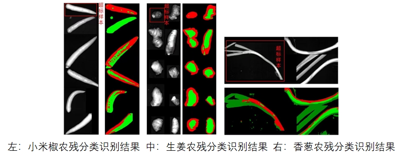 下图为使用光谱相机进行农残检测实验,蔬菜表面农药残留危害健康,利用光谱相机能够实现对蔬菜表面农残的分类识别,下图为小米椒、生姜和香葱的农残检测图: